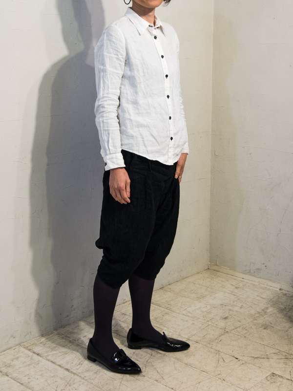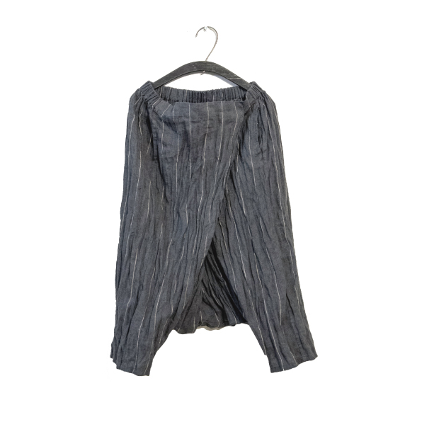 [サルエルパンツ] パンツの前はウエストを折り重ねてすっきりとさせ、後ろウエストにだけゴムを入れたサルエルパンツなのでスマートなラインに見えます。 色… ブラック/グレーピンストライプ
